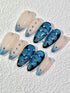 Shimmery blue butterfly nails with rhinestone accents and nude tips.