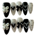 Chic black and white press-on nails with pearl hearts and elegant bow accents.