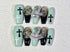 Striking emerald-green nails with painted black crosses, silver accents, and a bold pearl centerpiece for a gothic-luxe vibe.