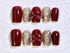 Elegant red nails with gold glitter and festive 3D bow accents.